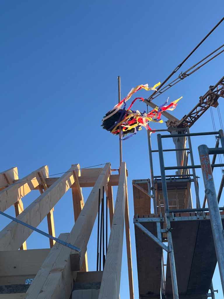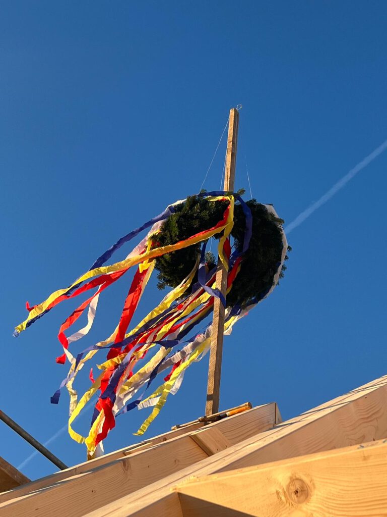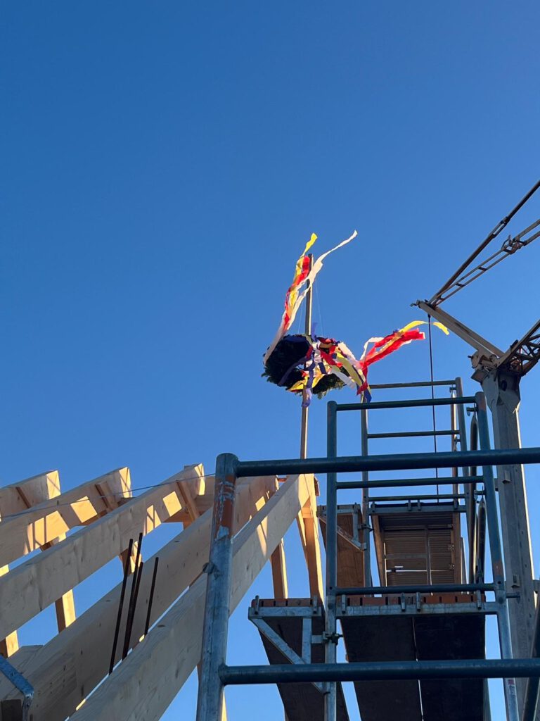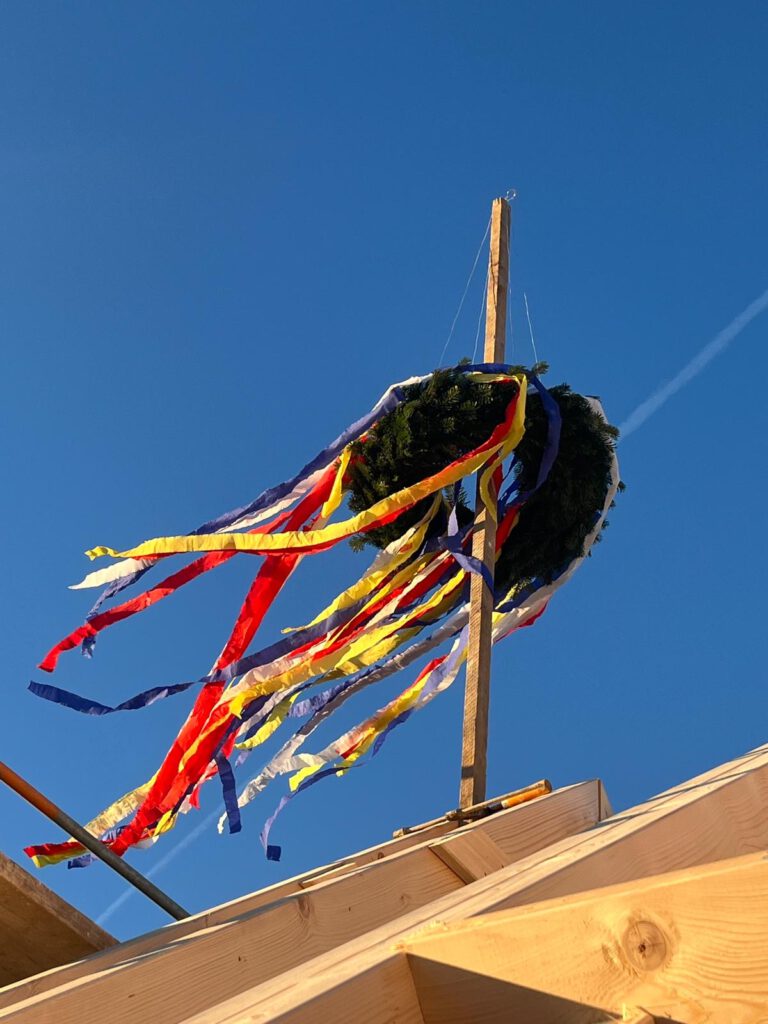 Der Zimmerer Herr Dünschede trug den Richtspruch vor, bevor der letzte Nagel in den Dachstuhl versenkt wurde – als Dank für die bisherige Arbeit und als Wunsch für einen weiterhin unfallfreien Verlauf. Passend zum Anlass wurde anschließend ein Schnaps gereicht, mit dem auf das Gelingen des Projekts angestoßen wurde.