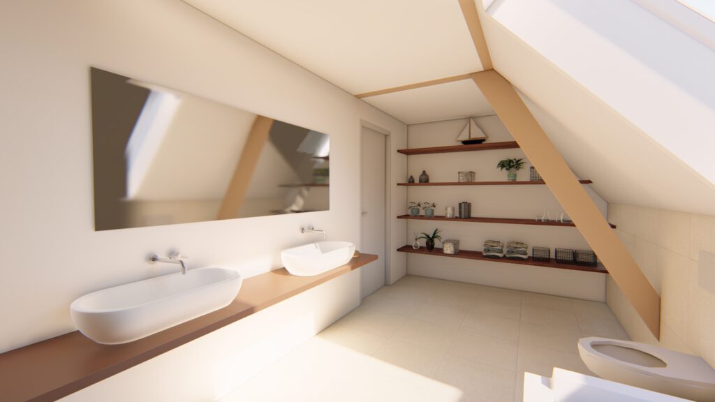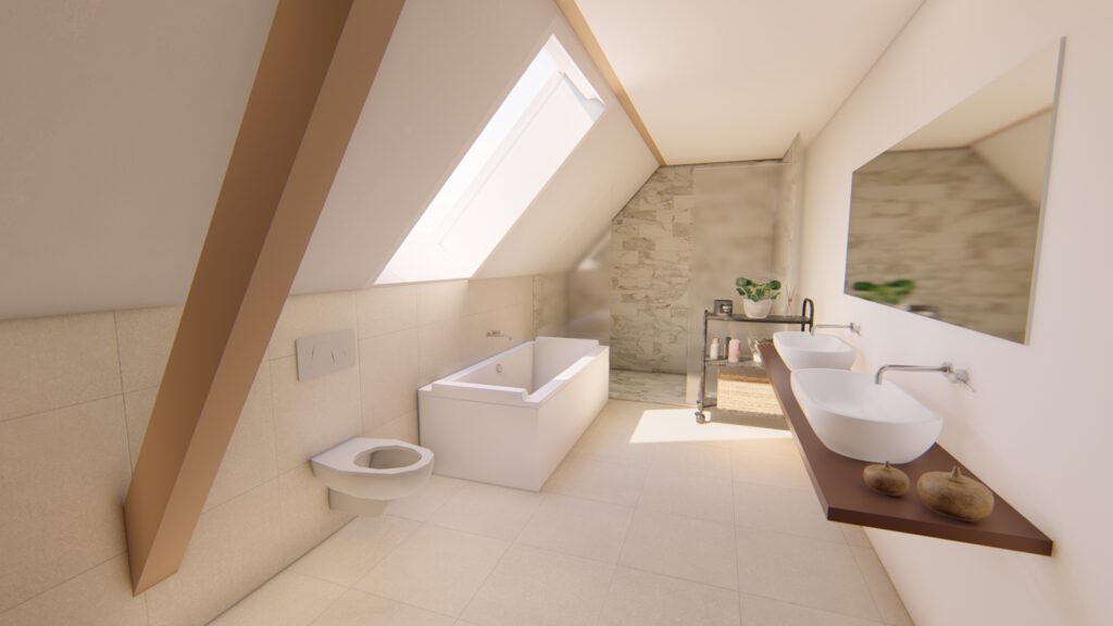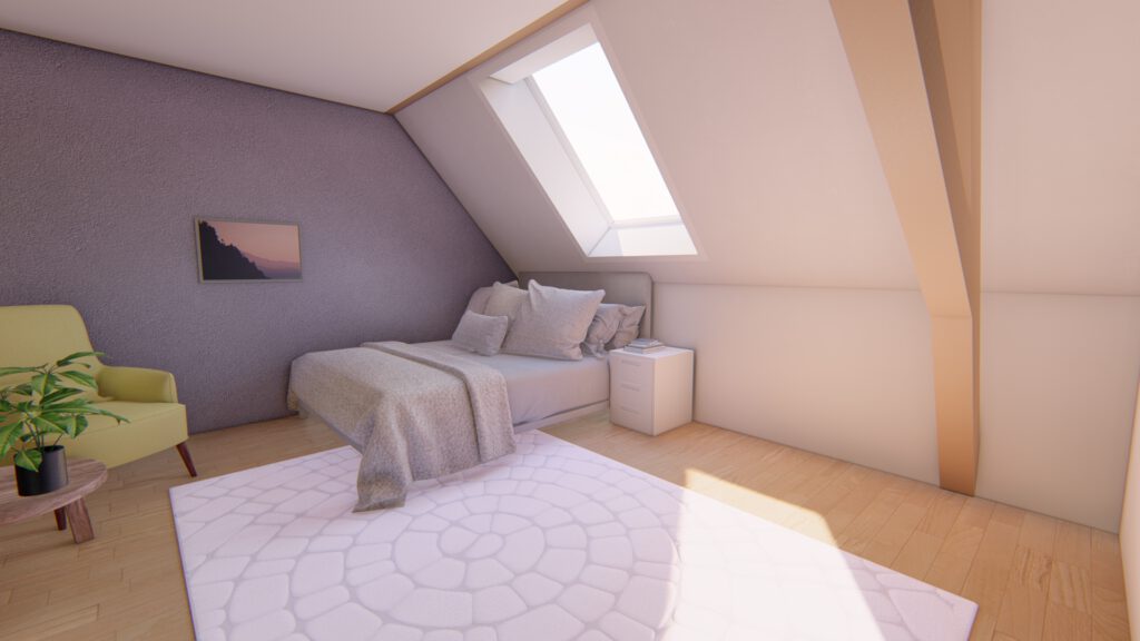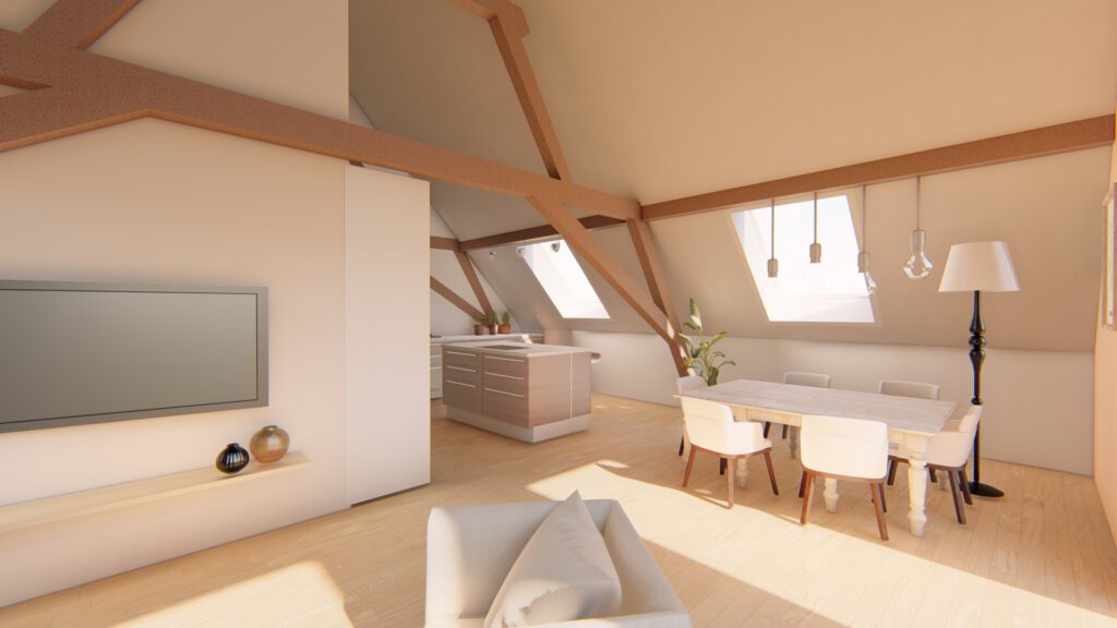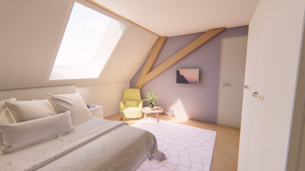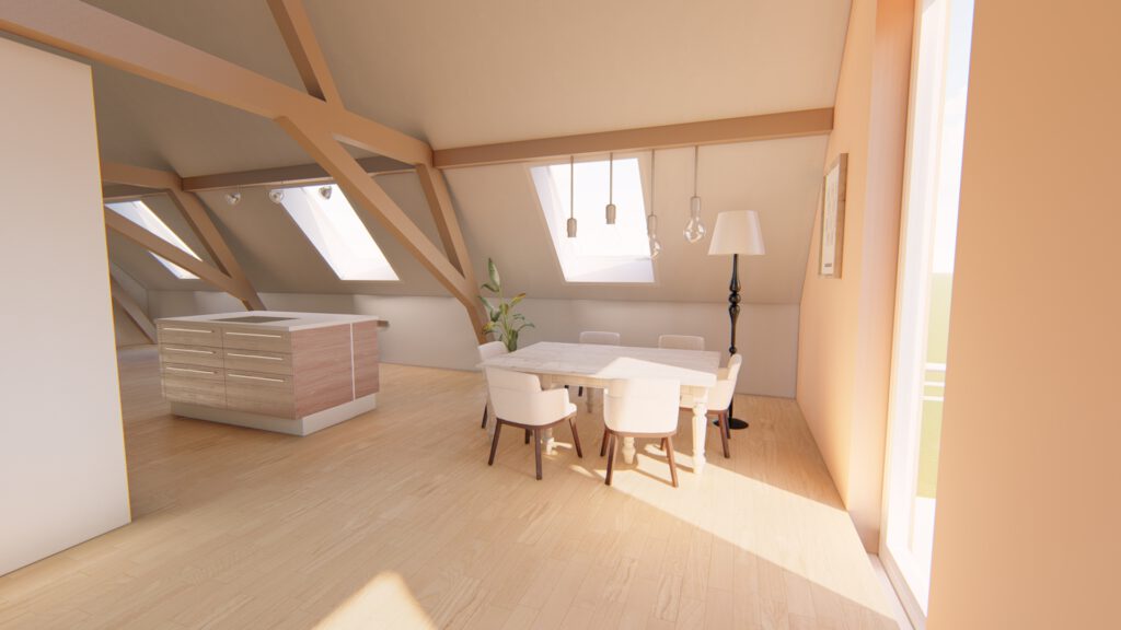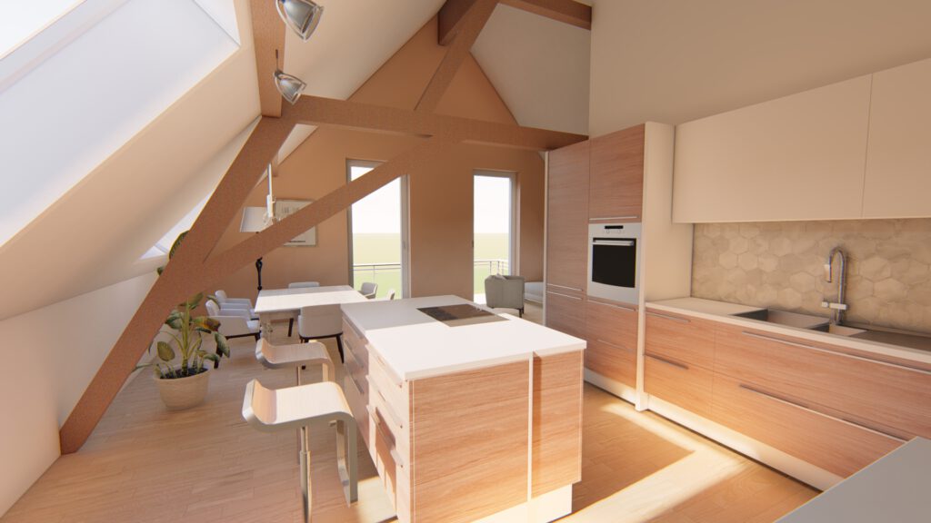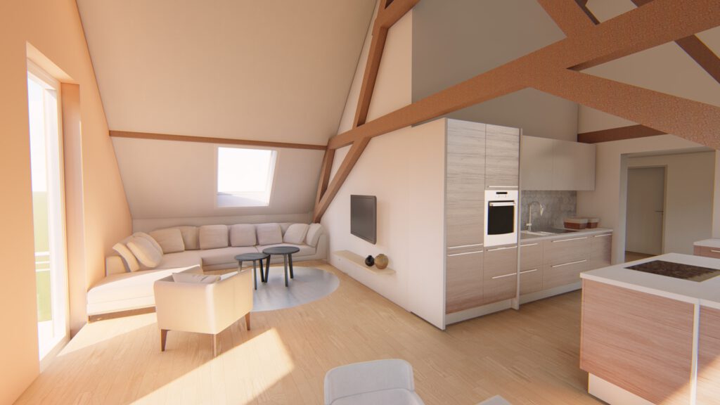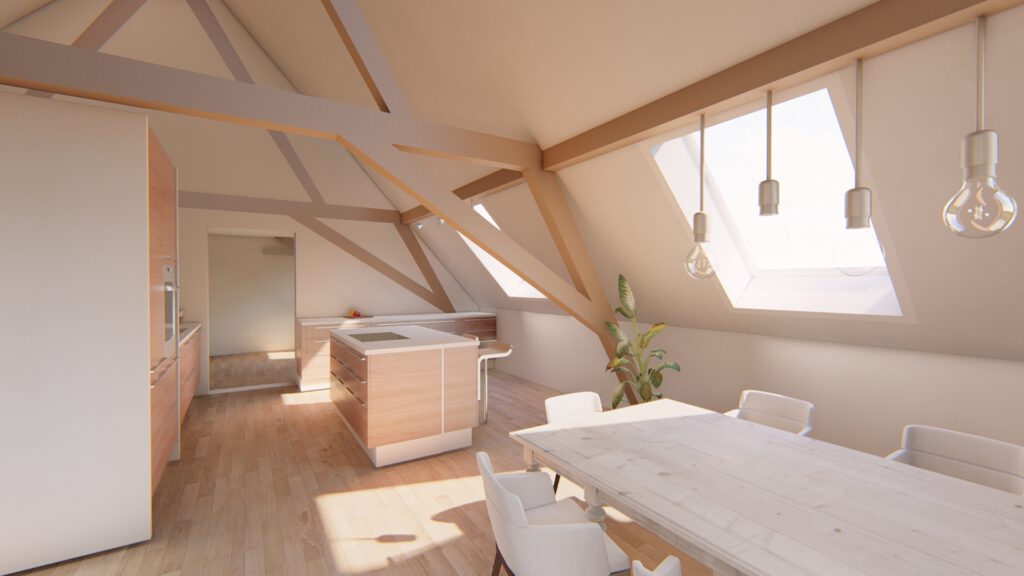 Bei dem Bauvorhaben haben wir den Ausbau eines Dachgeschosses geplant, um eine einladende Wohneinheit zu schaffen.Aufgrund der Dachkonstruktion war es wichtig, eine optimale Nutzung der Fläche zu finden. Das Ergebnis ist eine geräumige Wohneinheit mit einem großzügigen Koch-, Ess- und Wohnbereich, der Zugang zu einem Balkon bietet. Im hinteren Bereich befindet sich das Schlafzimmer mit einer angrenzenden Ankleide.