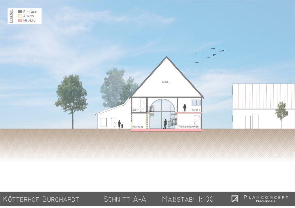 Durch das Entfernen und Setzen neuer Wände wurde der Grundriss optimiert und innen eine sinnvolle Wohnsituation geschaffen. Gleichzeitig musste die lichte Raumhöhe von 2,01m im Obergeschoss aufgrund der Beibehaltung der statischen Grundsituation und der dort vorhandenen Decke gehalten werden.